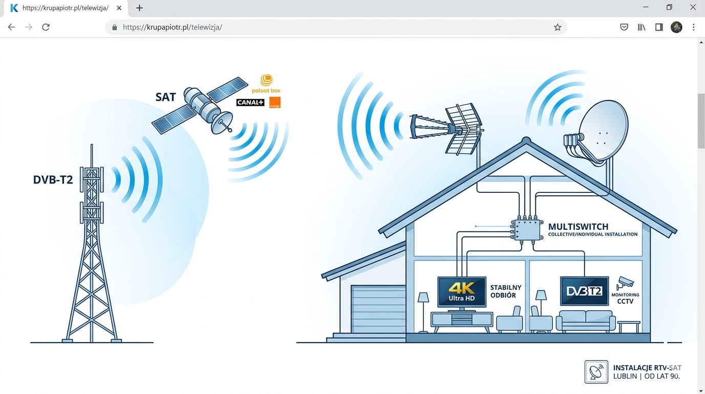 Zajmujemy się usługą montażu telewizji Naziemnej(DVB-T2), satelitarnej (DVB-S/S2) oraz telewizji przemysłowej nazywanej CCTV lub inaczej monitoringiem.